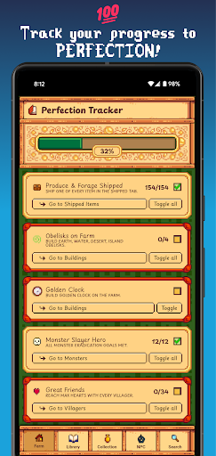 Instant access to info and checklists for everything in the game: Shipped Items, Fish, Artifacts, Minerals, Cooking & Crafting Recipes, Furniture, Buildings, Shops, Clothing, Weapons, Tools, Villagers, Monsters, Pets, and Farm Animals.